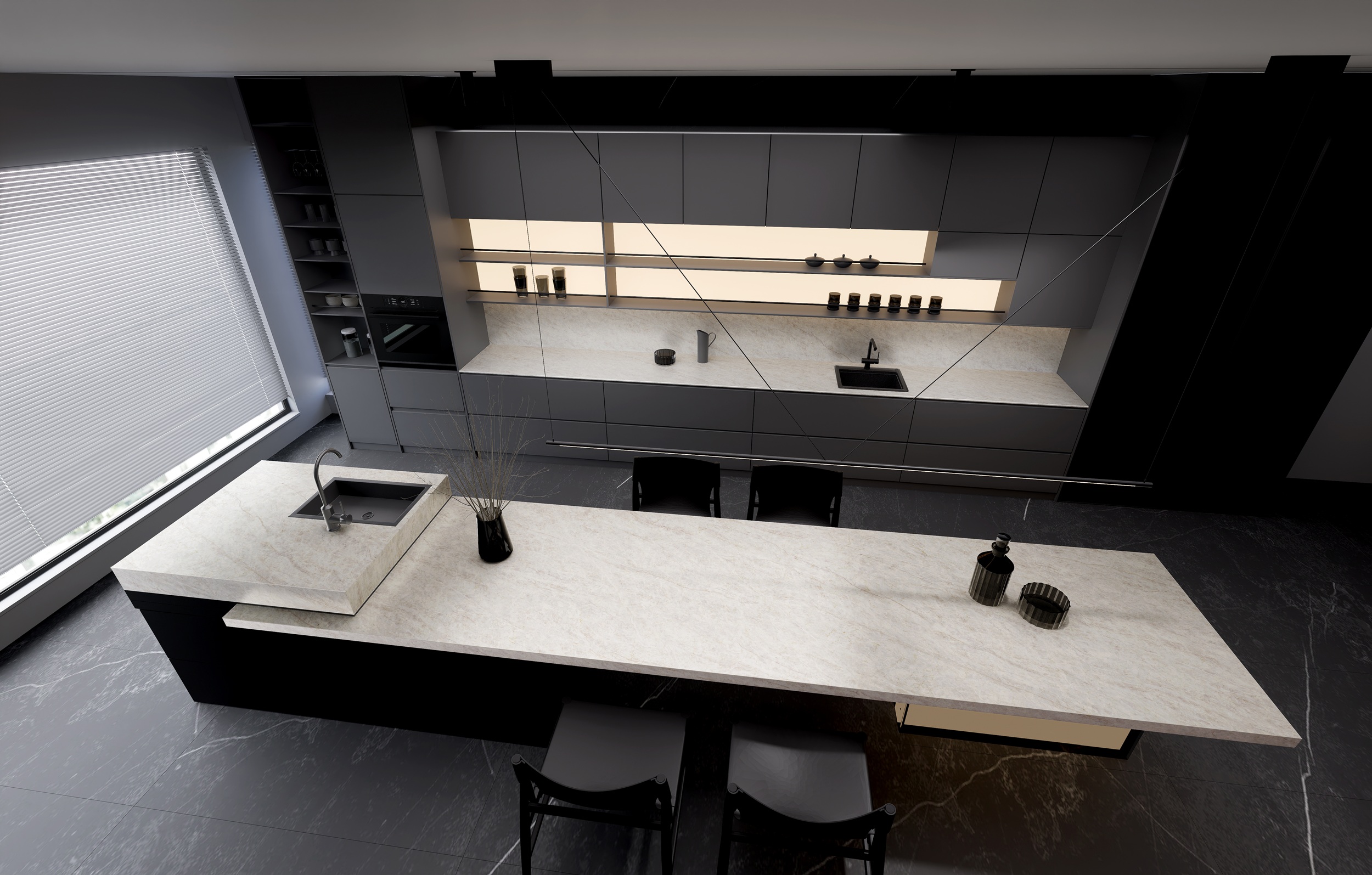 Phi Recycled Glass Surfaces feature a full-body performance of the slabs, replicating the 3D effect found in natural stones and simplifying the manufacturing process.
