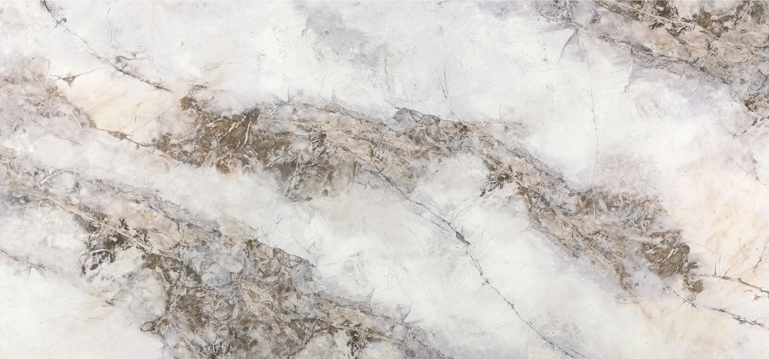 DESCRIPTION: This sophisticated pattern beautifully captures the grandeur of Calacatta marbles. Its luminous white canvas is adorned with sweeping veins in soft silvery grays, subtly interlaced with delicate golden accents that shimmer like threads of sunlight. Striking yet refined, this design embodies luxury and versatility, making it a perfect statement piece.
